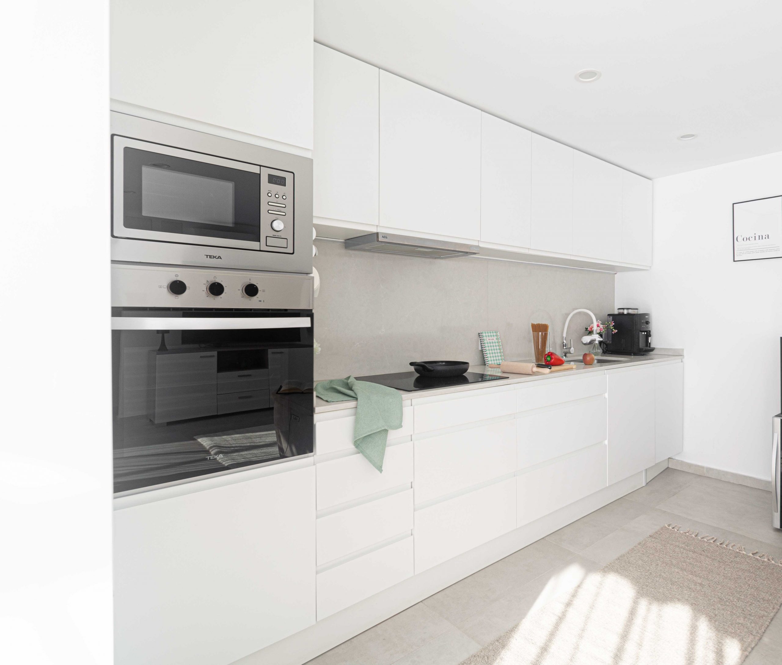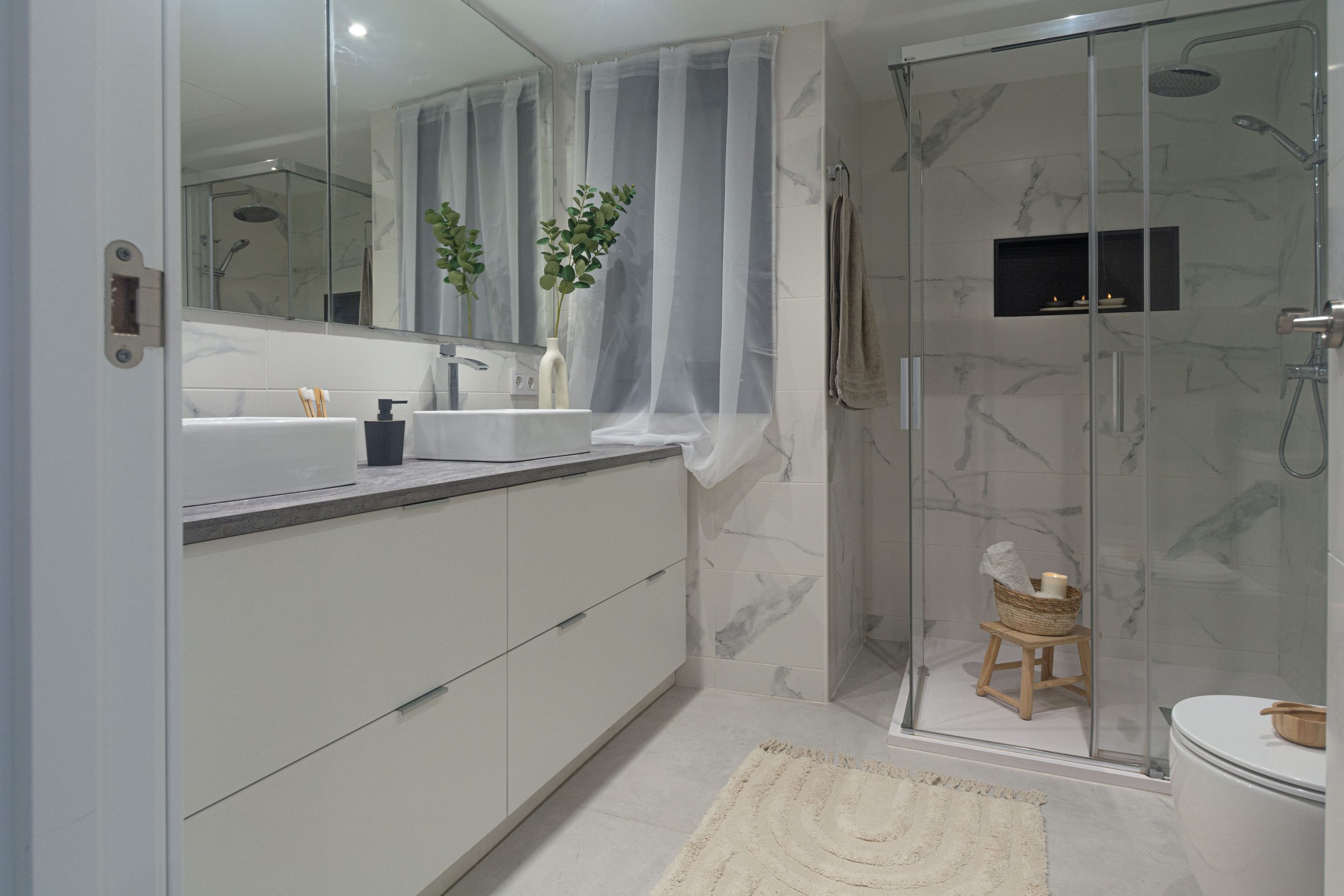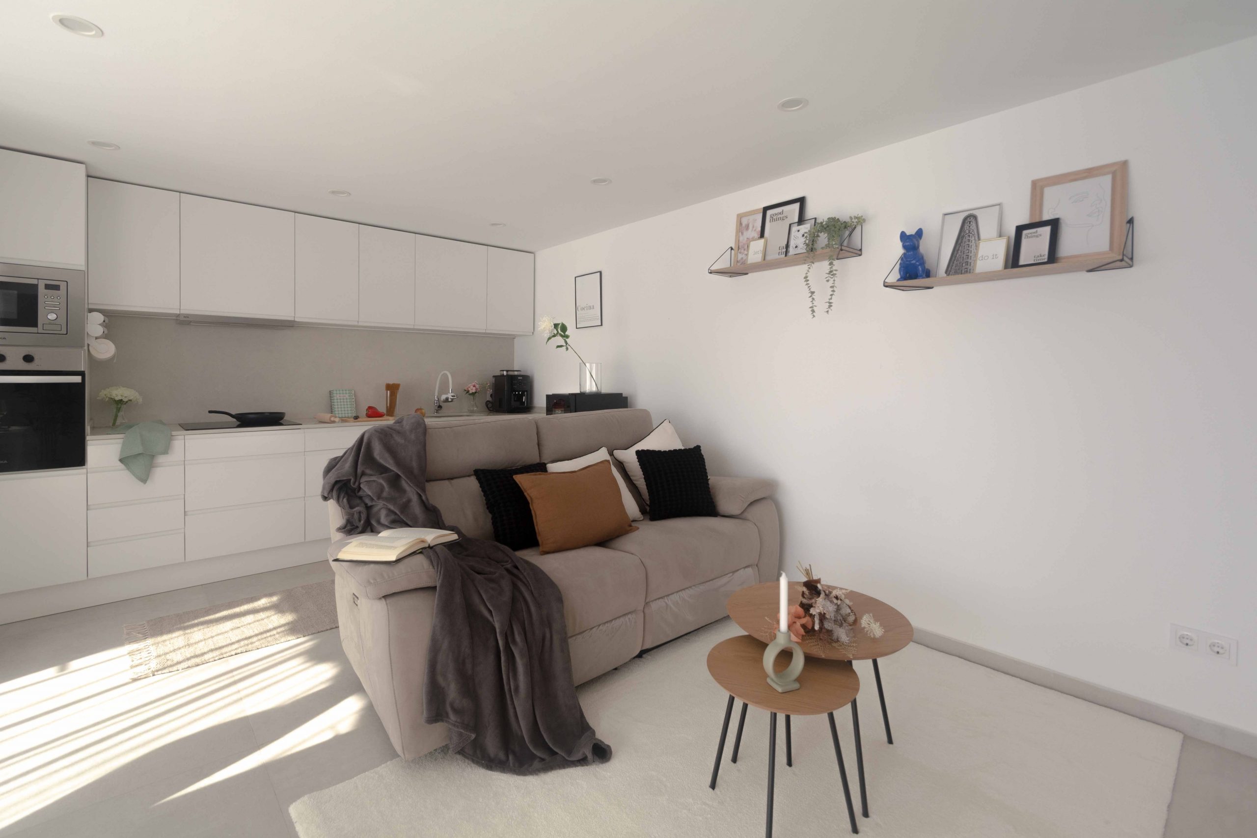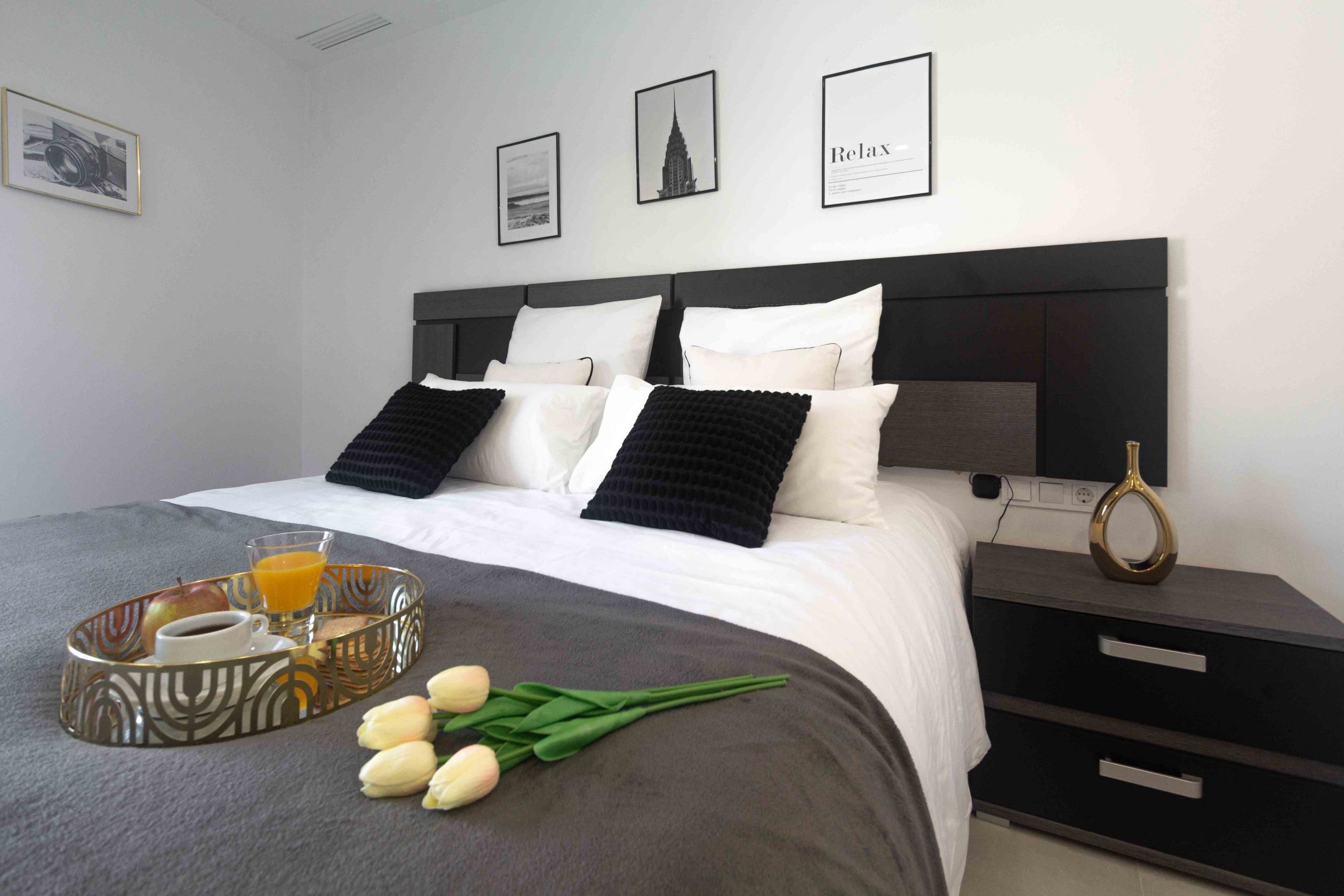 A este Ático de obra nueva le faltaba añadir un toque moderno, actual y con cierto punto de ambiente acogedor. Al salón tuvimos que cambiarle la mesa de centro que, ocupaba todo el espacio vital del salón, por otras mesitas más pequeñas, las cuales hacen que el espacio fluya orgánicamente. Los cojines también hicieron que el salón resaltara su protagonismo, junto con la puesta de diversos cuadros de manera informal en la pared lateral. A destacar el cambio que me atreví a darle a la habitación principal, jugando con diferentes tonalidades grises rompiendo con algunos atrezzos en dorado, convirtiéndola en una habitación de total lujo minimal. Por último, quisiera resaltar el trabajo realizado en el lavabo principal, incluyendo una cortina en la ventana para quitar esos puntos negros que es donde se va la vista y aportando texturas y confort con la alfombra, dándole un toque natural con el jarrón de laurel y los kits de cuidados para el baño.